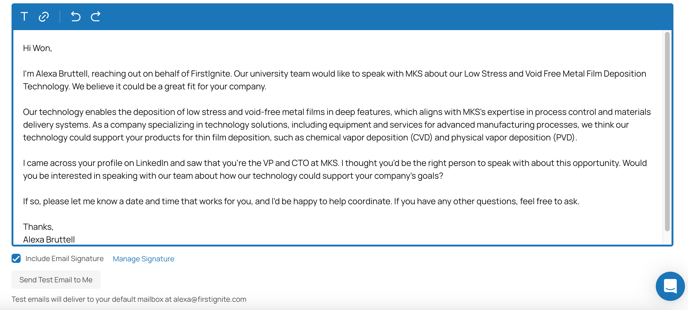 Our tool harnesses the power of artificial intelligence to analyze the alignment between your research and company interests, enriched with detailed contact background information. The outcome? Highly customized emails that resonate deeply with your recipients, enhancing your chances of building meaningful connections.